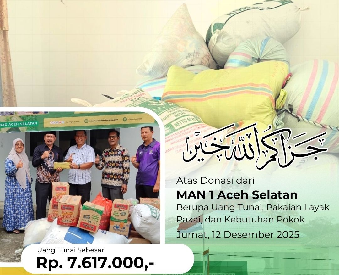 Aceh Selatan, 12 Desember 2025 – Semangat kepedulian sosial kembali tumbuh di kalangan Dewan Guru dan siswa-siswi MAN 1 Aceh Selatan. Pada Kamis (12/12), Kepala Madrasah, Dewan Guru dan siswa-siswi secara simbolis menyerahkan donasi untuk korban banjir di wilayah Aceh Sumatera kepada pihak HUMAS MAN 1 Aceh Selatan. Bantuan yang disalurkan berupa pakaian layak pakai, bahan pokok, serta uang tunai sebesar Rp 8.380.000.